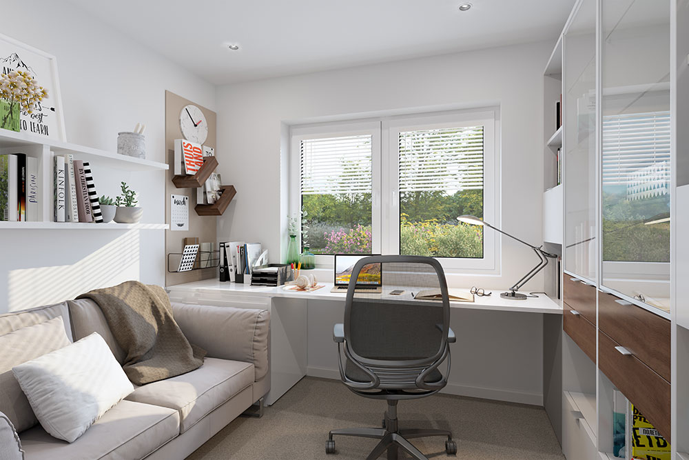 In den vergangenen Jahren haben wir bei unseren Massivhäusern schon zahlreiche Büro-Träume wahr werden lassen. Büros in Loft-Optik mit direktem Zugang zur großflächigen Dachterrasse. Büros im Souterrain mit separatem Eingang, großräumige Büros mit viel Stauraum oder zusätzlichen Arbeitsflächen, um kreative Ideen direkt in die Tat umzusetzen.