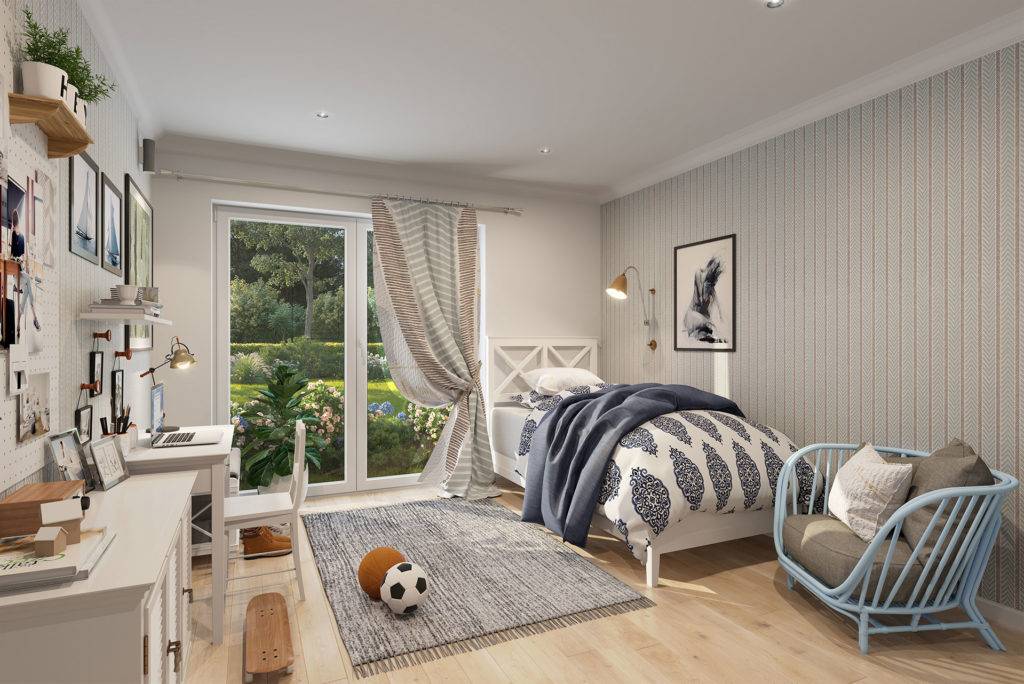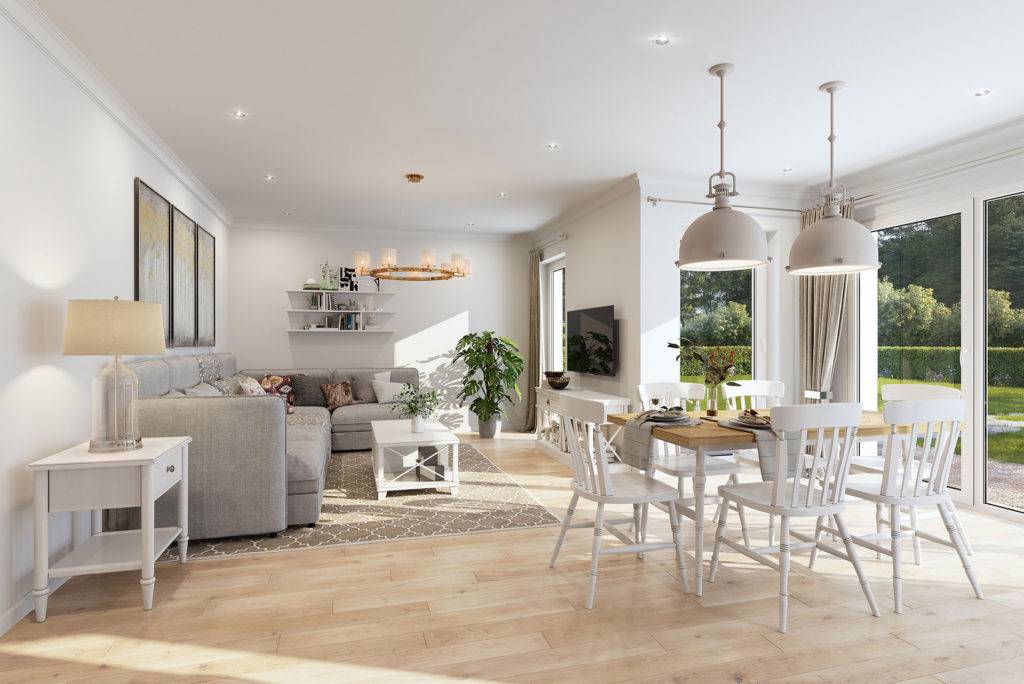 Unsere Architekten haben mit dem Chalet 122 edition eindrucksvoll gezeigt, wie sich 122 qm optimal aufteilen lassen, damit ein Wohntraum auf einer Ebene entsteht. Für mehr Licht und Luftigkeit sorgt ein Erker, der den Wohn-/Essbereich deutlich vergrößert. Auch die offene Küche schafft ein Gefühl von Weite. Die Eltern haben ein eigenes Bad, ein zweites befindet sich zwischen Kinderzimmer und Büro.