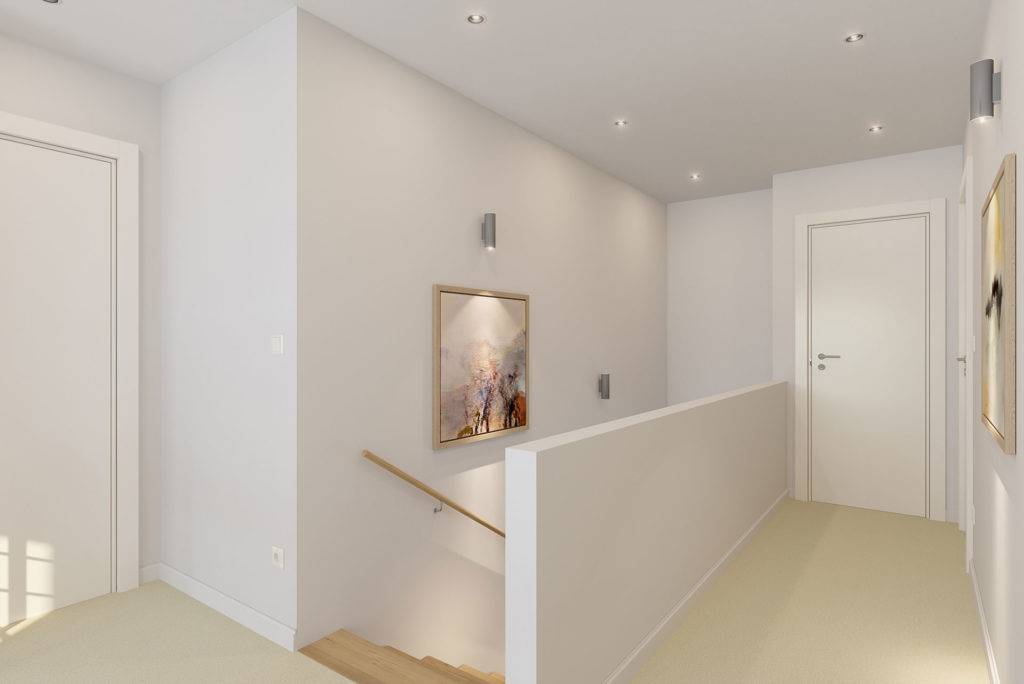 Neben der nach unten seitlich auslaufenden Treppe gelangt man beidseitig in den Wohn-/Essbereich mit offener Küche. Dieser orientiert sich klar zum Garten. Die symmetrische Architektur setzt sich im Obergeschoss fort. Auf der einen Seite der nach unten offenen Galerie liegen die Kinderzimmer mit separatem Kinderbad, auf der anderen Seite der Elternbereich samt Ankleide und Elternbad.