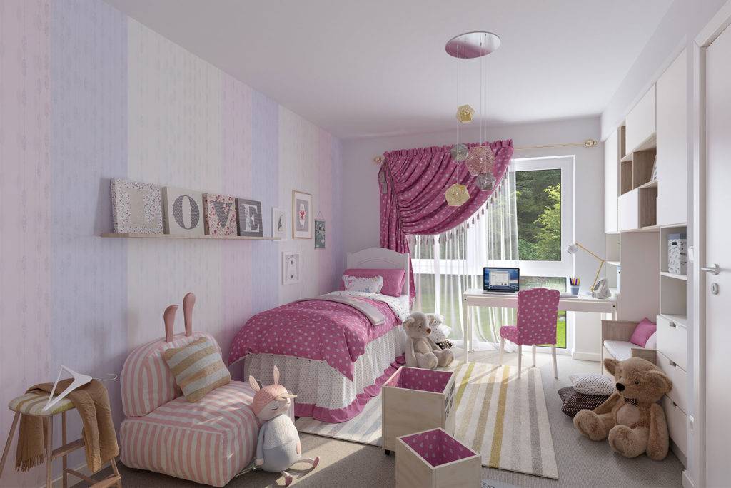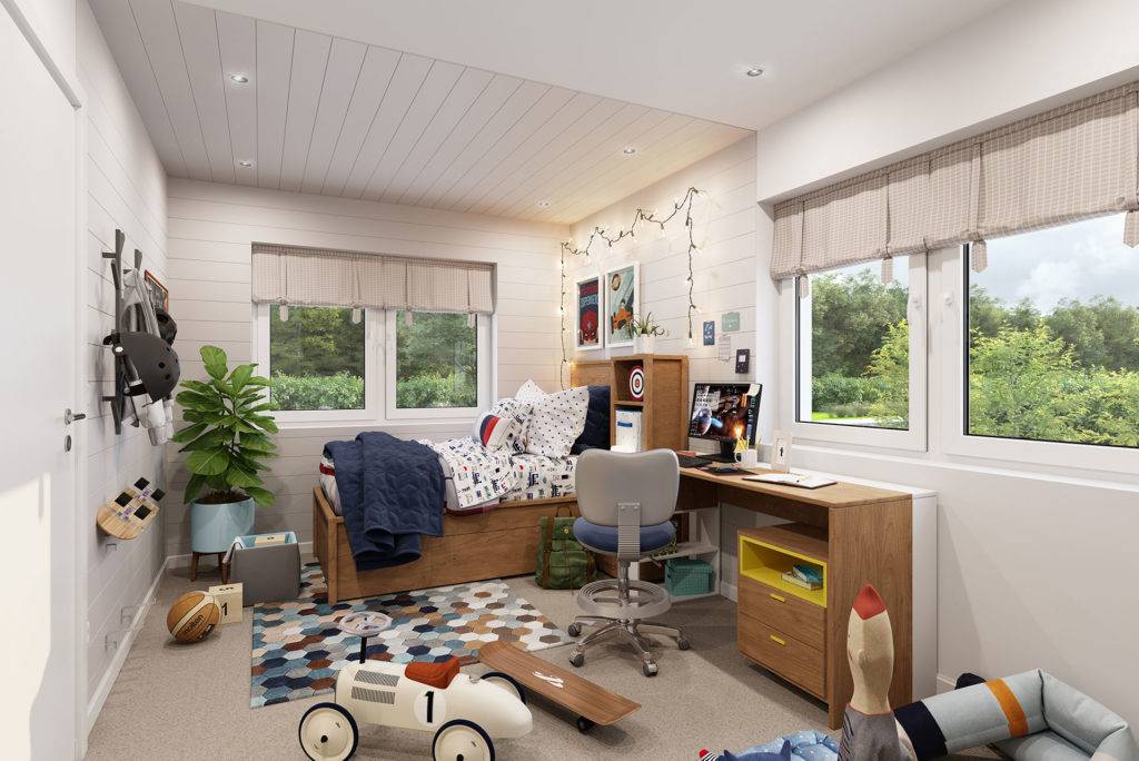 Beide Kinderzimmer haben fast dieselbe Größe und sind auch ähnlich aufgeteilt. Eines hat ein wenig mehr Licht durch zwei Fenster mit Brüstung, das andere bietet den Blick in den Garten und ein bodentiefes Fenster.