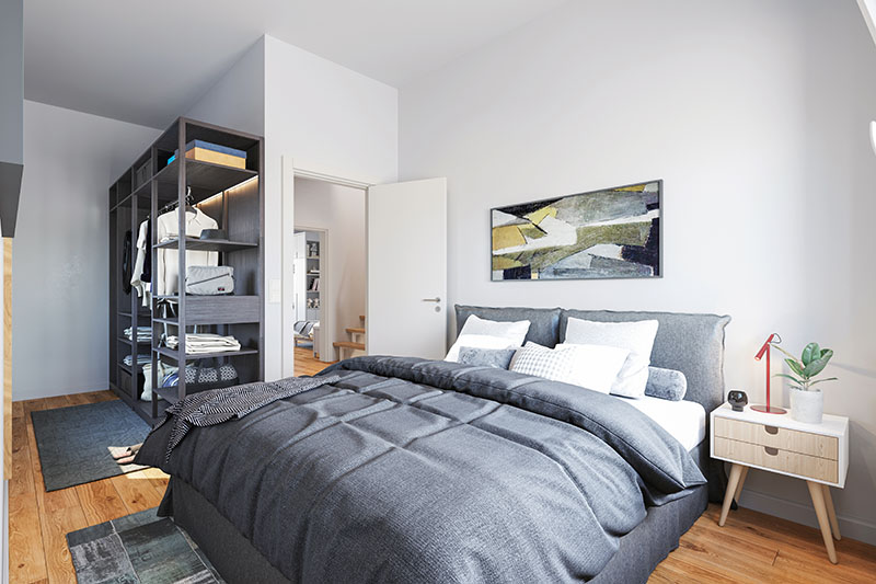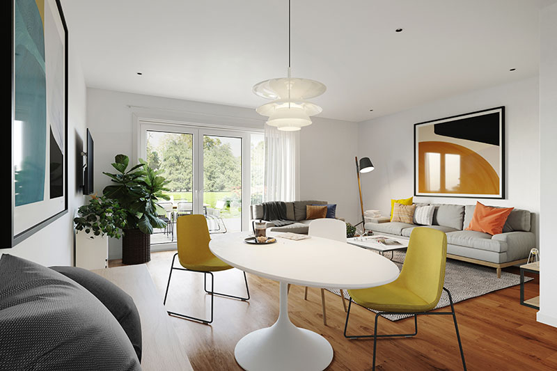 Im Innern beeindruckt der einladende Wohn- / Essbereich mit seiner integrierten, offenen Küche. Das Obergeschoss bietet Platz für zwei Kinderzimmer, Bad und Schlafzimmer. Das Studio im Staffelgeschoss können Sie als Hobbyraum nutzen oder es zu Ihrem persönlichen Fitnessbereich machen, es einfach als Raum für Ihre Auszeit einrichten oder zum funktionalen Büro werden lassen - kurzum es ist vielseitig nutzbar. Außerdem bietet das Studio einen direkten Zugang zum großen Dachgarten, der architektonische Akzente setzt.