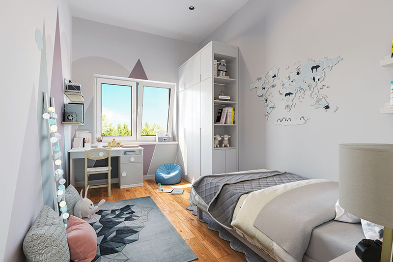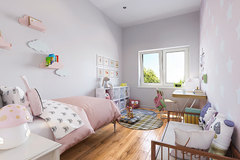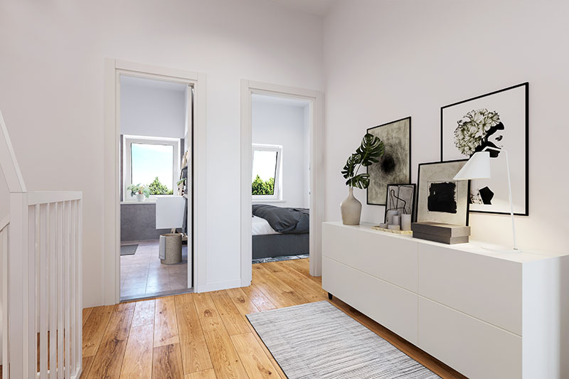 Gerne können Sie sich selber einen Überblick verschaffen und einen 3D Rundgang starten. Sie befinden sich zu Beginn im Eingangsbereich des Hauses, der Diele, von hier aus kommen Sie direkt in den Kern des Hauses. Im lichtdurchfluteten Wohnzimmer mit der angrenzenden offenen Küche finden Sie zusätzlich die perfekt in den Raum integrierte Treppe zur oberen Etage. Die Treppe hoch landen Sie im Flur des Obergeschosses, mit Zugang zum Bad, dem Elternschlafzimmer, sowie 2 Kinderschlafzimmern.