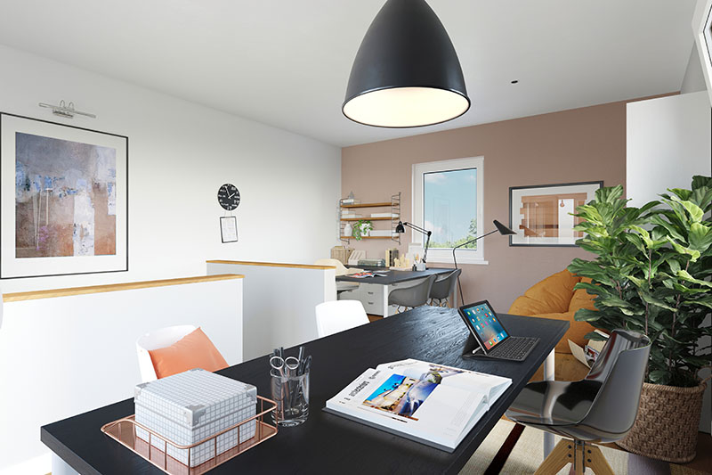 Noch einmal die Treppe hoch und Sie befinden sich in einem der Highlights, dieser Doppelhaushälfte. Dem Home Office. Einem offenen Workspace, der für die ganze Familie Sitzplätze zum arbeiten bereit hält. Für eine kurze Pause ist der Gang von hier aus nicht weit, denn nach wenigen Schritten befinden Sie sich schon auf der Dachterrasse Ihres Hauses.