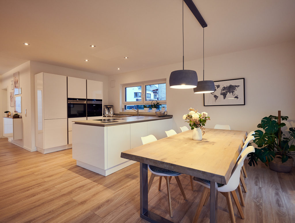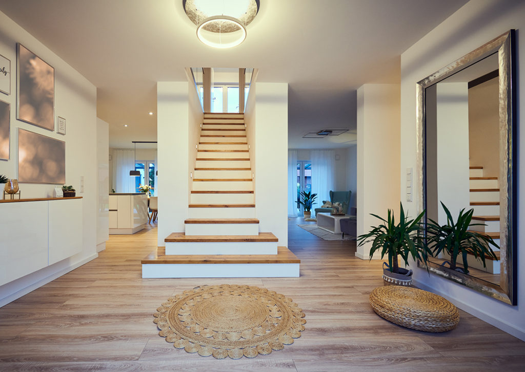 Bereits beim Betreten des Hauses wird klar: Hier verbinden sich modernes Design und Wohlfühlatmosphäre zu einem einzigartigen Wohnkonzept. Der offene Eingangsbereich mit seiner stilvollen Treppe und viel Tageslicht schafft eine beeindruckende erste Begegnung und gibt den Blick frei auf das Herzstück des Hauses. Die offene Küche mit angrenzendem Essplatz lädt zum Genießen und Zusammensein ein, während das Wohnzimmer mit viel Licht und stilvoller Einrichtung Gemütlichkeit ausstrahlt. Praktische Details wie der Vorratsraum ergänzen das durchdachte Wohnkonzept. Im Obergeschoss sorgen ein elegantes Schlafzimmer mit Ankleide sowie ein kreatives Kinderzimmer für Rückzugsorte voller Komfort.